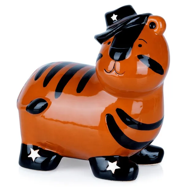 Efektowna skarbonka w kształcie uroczego tygryska. Idealna dla wszystkich osób, które chcą rozpocząć proces oszczędzania. Doskonale sprawdzi się do zbierania banknotów lub monet. Solidnie wykonana, stanowi element dekoracyjny. Skarbonka świetnie sprawdzi się na prezent. Wyprodukowano zgodnie z europejskimi standardami.