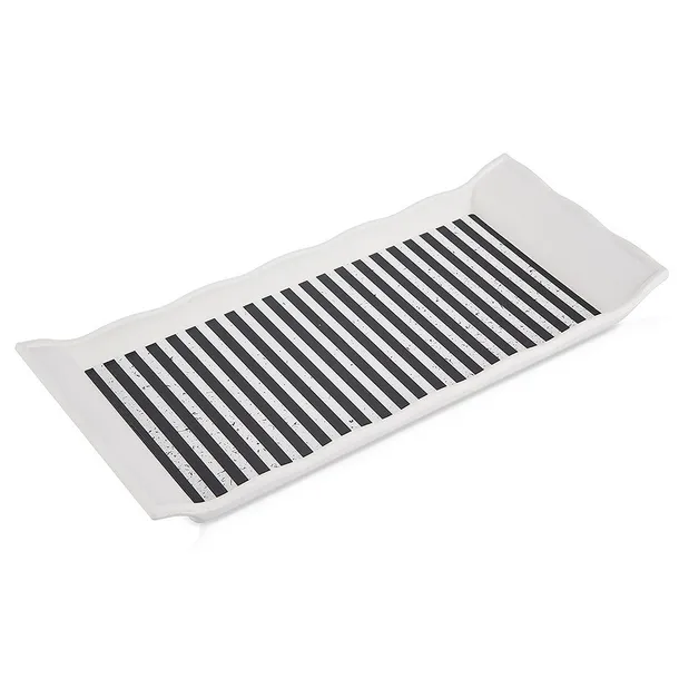 ✅ Solidna i wytrzymała - Wykonana jest z najwyższej jakości tworzywa w białym kolorze. Wewnętrzna część tacy jest w biało - czarne pasy.