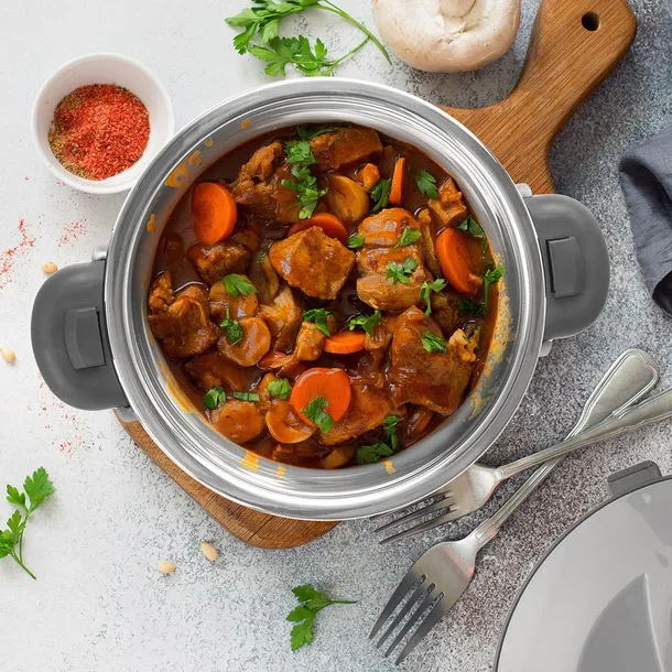 ✅ Wykonana ze stali nierdzewnej - Termomisa wewnątrz wykonana jest ze stali nierdzewnej. Zewnętrzna obudowa wykonana jest z tworzywa w szarym, perłowym kolorze. Pokrywka w kolorze szarym, a uchwyty w ciemno szarym kolorze.